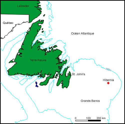 Le champ Hibernia est situé sur le nord-est des Grands Bancs, à environ 315 km au sud-est de St. John’s, Terre-Neuve, dans une profondeur d’eau d’environ 80 mètres (figure 1). Le champ couvre une superficie d’environ 223 kilomètres carrés et, à l’époque où sa mise en valeur a été initialement proposée, le promoteur estimait qu’il contenait quelque 98 106 m3 (520 millions de barils) de pétrole récupérable dans deux réservoirs distincts, Hibernia et Avalon.