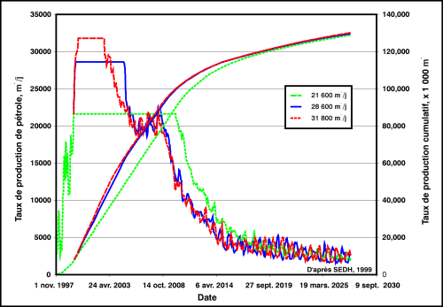 Le promoteur a également déclaré que ses études de simulation de réservoir ont comparé la récupération cumulative du pétrole par bassin et par bloc faillé pour des taux de production moyens de pointe de 21 600 m3/j (135 000 b/j), 28 600 m3/j (180 000 b/j) et 31 800 m3/j (200 000 b/j) et que les résultats des études indiquent que l’augmentation du taux n’aura pas d’effet négatif sur la récupération cumulative du champ.