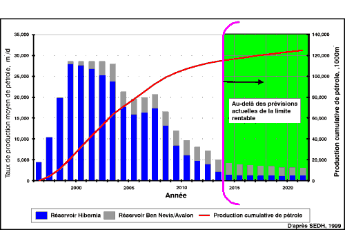 Dans le plan de mise en valeur d’Hibernia soumis en 1985, les promoteurs ont présenté une prévision de production de pétrole avec un niveau de production de pétrole plateau équivalent à un taux quotidien moyen annuel de 17 500 m3/j (110 000 b/j). Les prévisions de production étaient basées sur des réserves probables de 83 106 m3 (520 millions de barils) pour le réservoir Hibernia et les réservoirs Ben Nevis/Avalon, le schéma d’épuisement présenté dans le plan et la capacité nominale de l’installation de production proposée de 23 848 m3/j (150 000 b/j). En établissant les prévisions, le promoteur a tenu compte des temps d’arrêt prévus et a supposé que chaque puits de production fonctionnerait à un taux annuel moyen de 1 590 m3/j (10 000 b/j) avec une efficacité d’exploitation globale de 90 %. De plus, en raison de l’incertitude concernant la performance des réservoirs et du fait que les zones de réservoirs de qualité moins favorable seraient forées après l’atteinte de la production maximale, l’efficacité des puits a été estimée à 81 % après la période d’accumulation de la production.